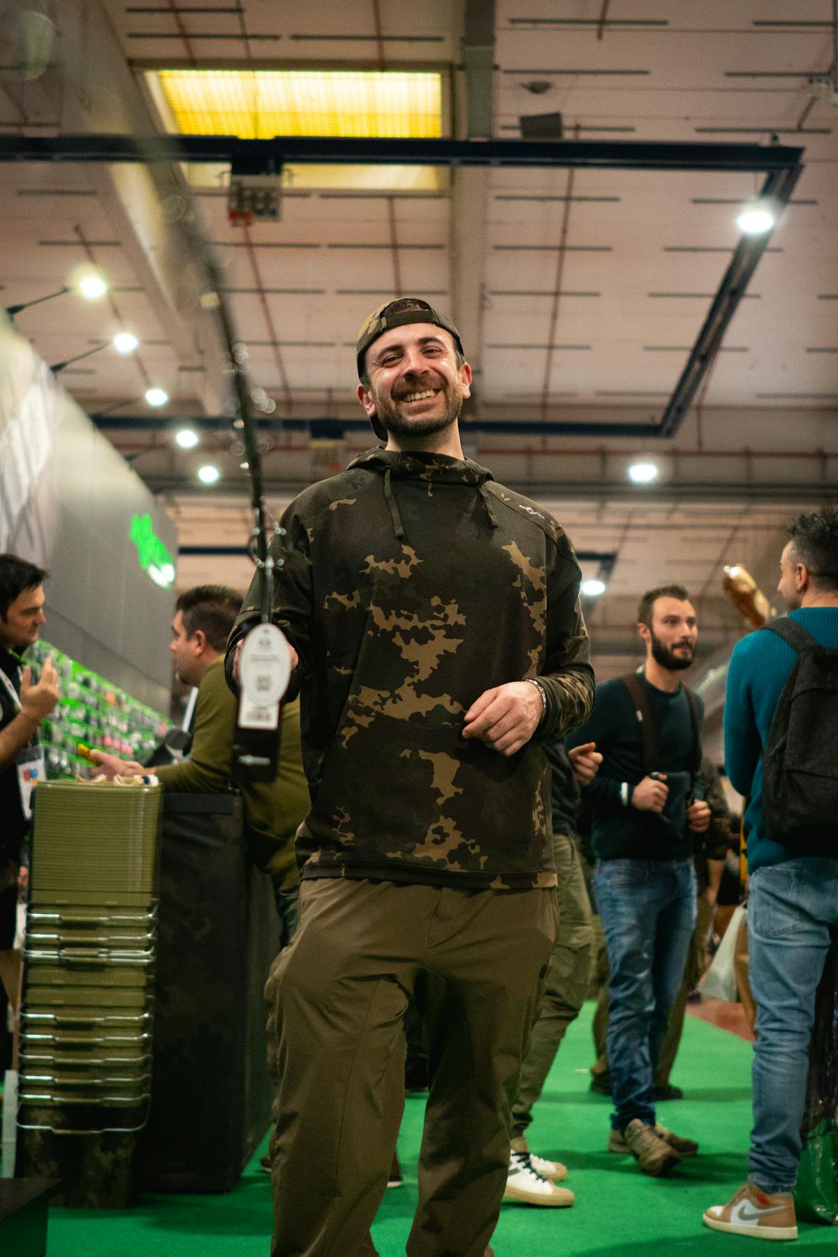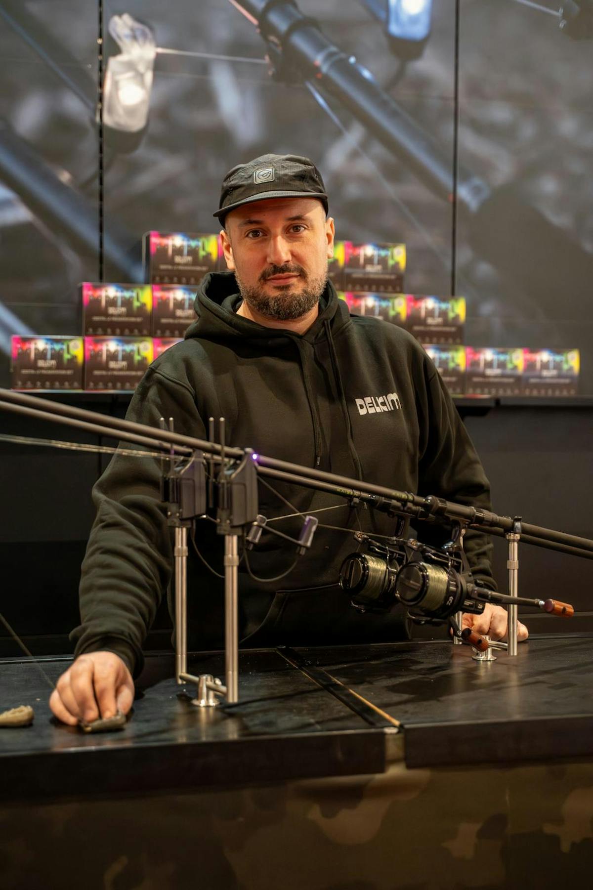 Luca Corrà era a disposizione dei visitatori per guidarli passo passo nella costruzione dei propri rig preferiti. Con grande pazienza e competenza, Luca spiegava ogni dettaglio: dalla scelta dei componenti più adatti alla combinazione ottimale di terminali, girelle e ami, fino ai piccoli trucchi che permettono di rendere il rig più efficace in acqua. I visitatori hanno avuto così l’opportunità di osservare dimostrazioni dal vivo, fare domande specifiche e replicare immediatamente le tecniche apprese, rendendo la visita allo stand un vero laboratorio pratico di carp fishing.
