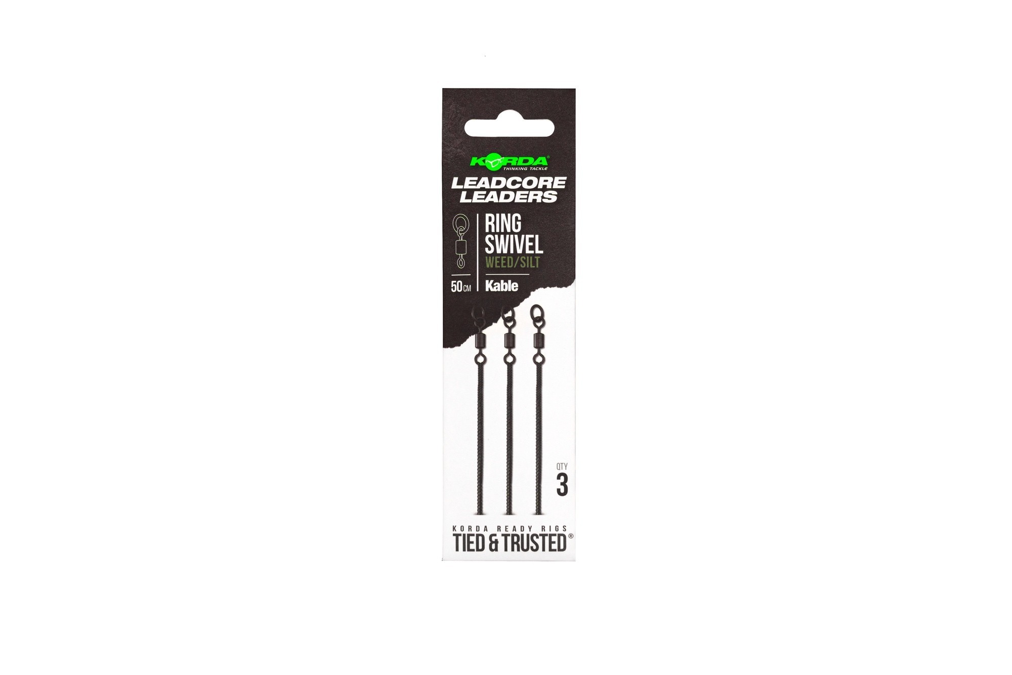 Each leader is constructed from our incredibly tough and fast-sinking Kable leadcore, with a Size 8 Ring Swivel spliced to one end of it and a spliced loop at the other end so that it can quickly be attached and detached from your main line as required. The Size 8 Ring Swivel version is extremely versatile as they can be used in conjunction with various Korda components such as Lead Clips, Inline Leads and Running Rigs, giving you the flexibility to change your approach quickly and efficiently.