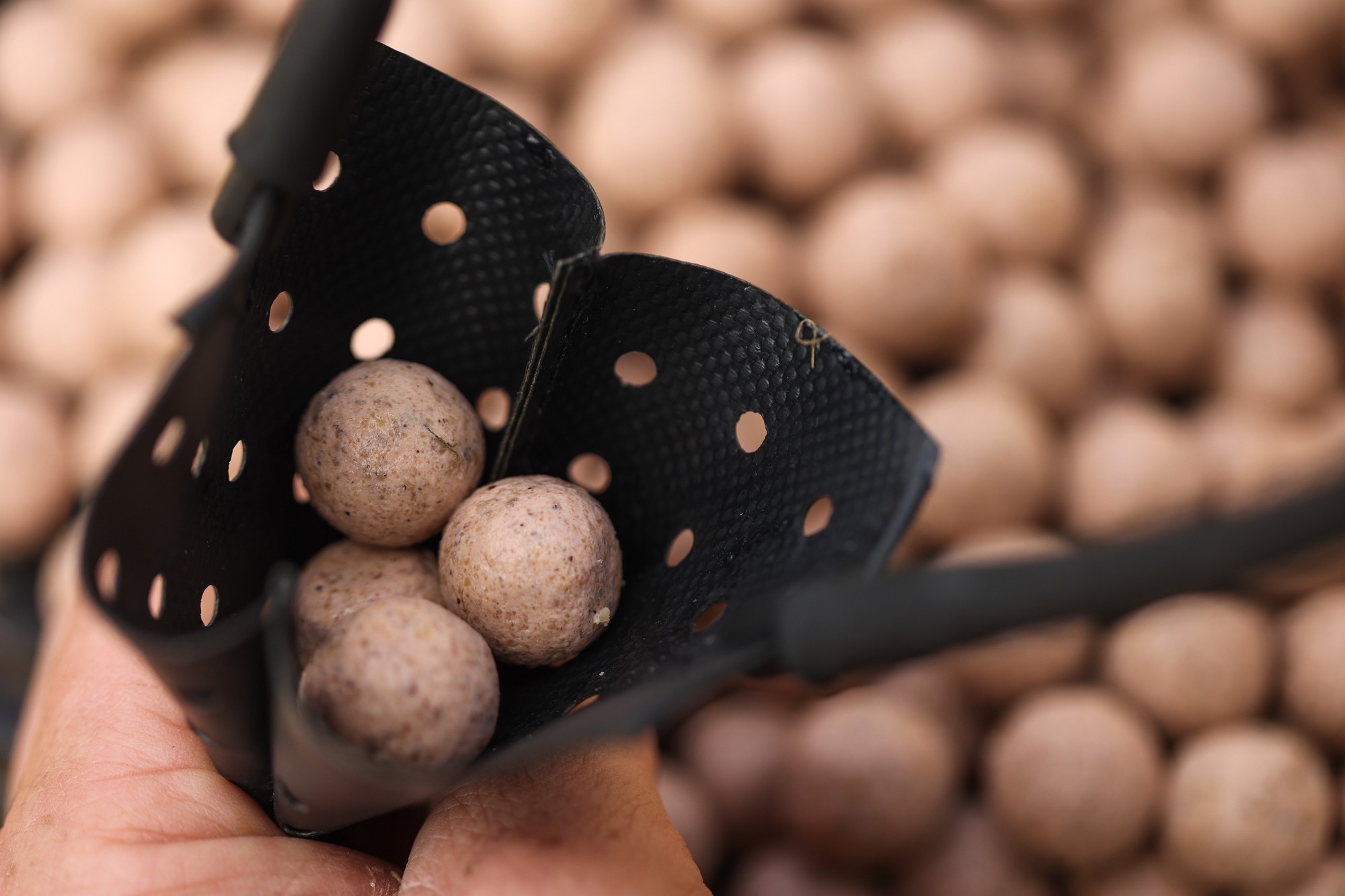 Each Katapult features a lightweight hollow, yet very strong, nylon frame with a textured handle that has been ergonomically designed to fit in your hand comfortably as well as allowing you to get a good grip, even with wet hands or ones covered in particle juice! The pouches feature drainage holes as well as extra strengthening around the area where it attaches to the elastic (which can be replaced and new elastic fitted to the connectors with ease), and are shaped to ensure that your bait lands where you want it to, allowing for tight grouping with multiple boilies, tiger nuts or similar, when putting a few out at a time (filling the pouch will give a wider spread).